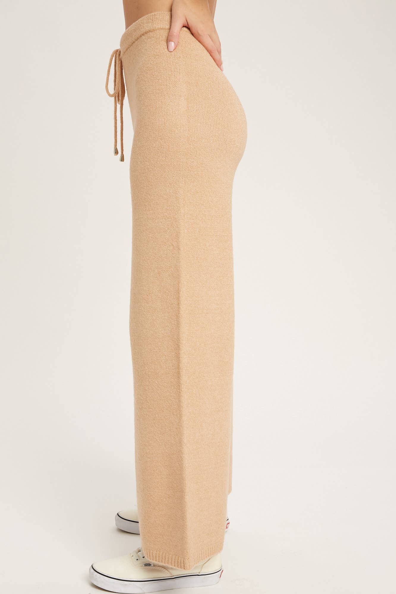 Cozy casual sweater pants features an elastic waist with adjustable spaghetti string, wide leg and a relaxed fit. -Model is 5'8" and wearing a Small
