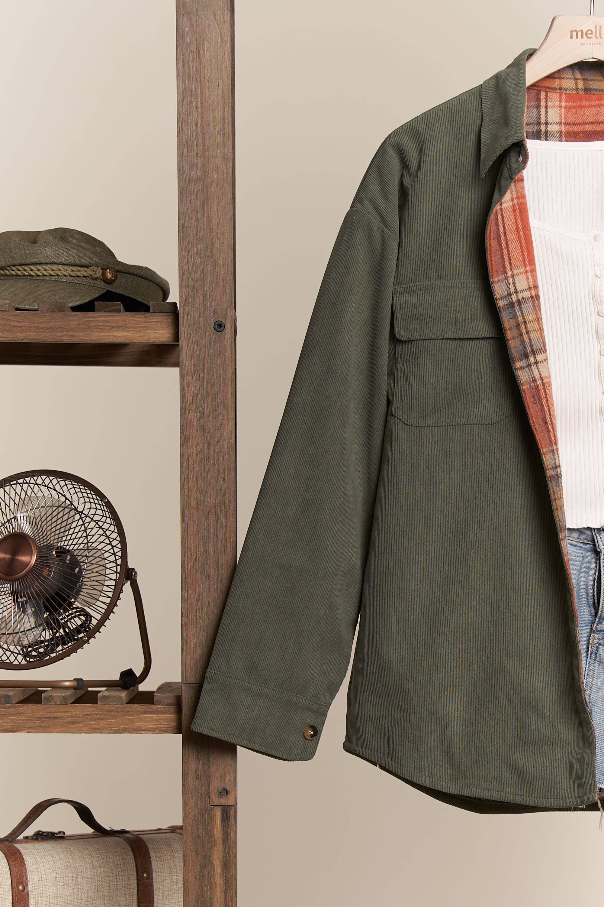 Reversible Corduroy and Plaid Button Down Shirt Jacket. Actual product color may vary from the images shown. Every monitor or mobile display has a different capability to display colors, and every individual may see these colors differently.