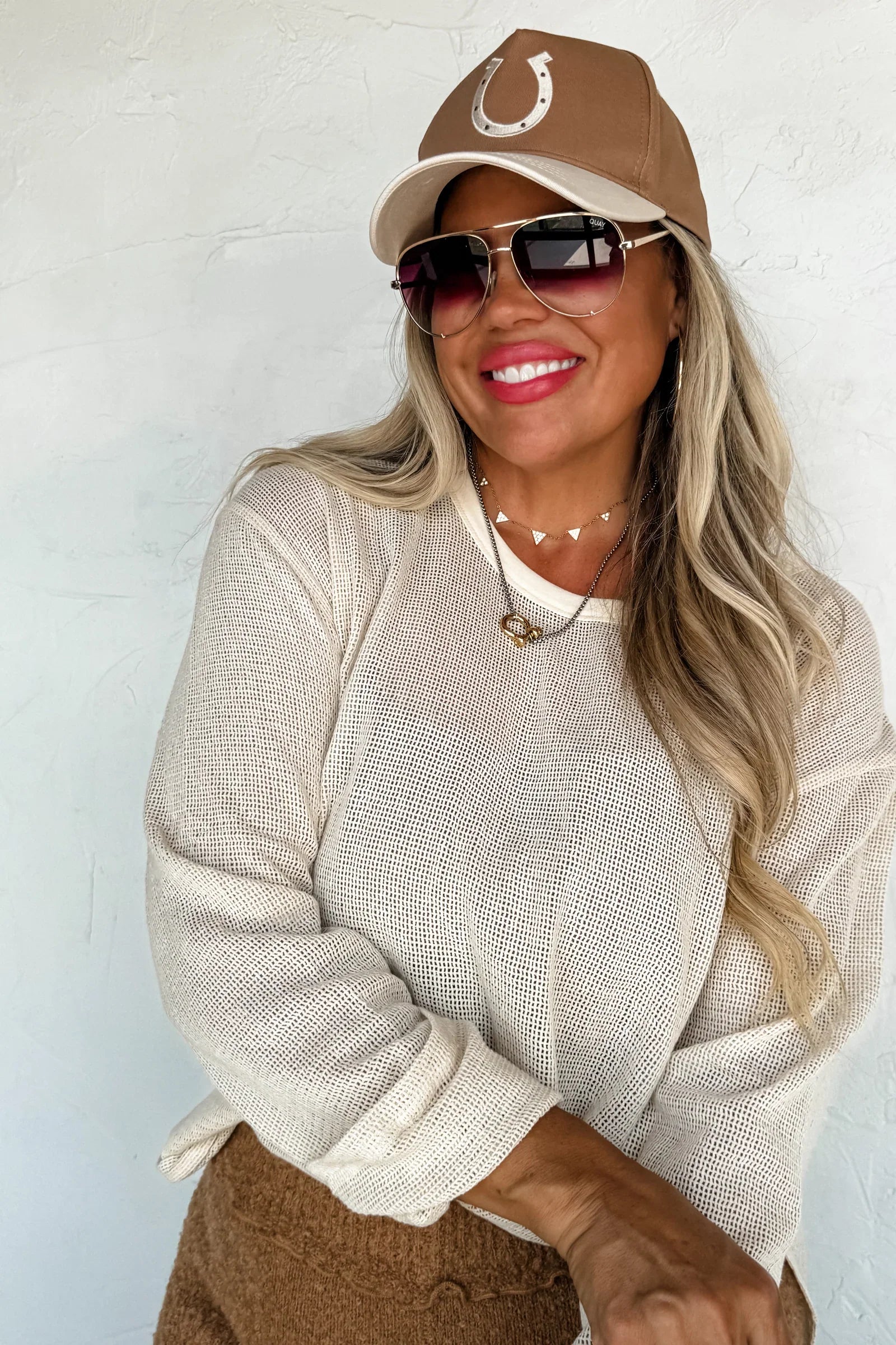 All in a breathable cotton mesh fabric with texture that feels light and airy. Has a ribbed neckline that is wide, making it easy to style off the shoulder too.