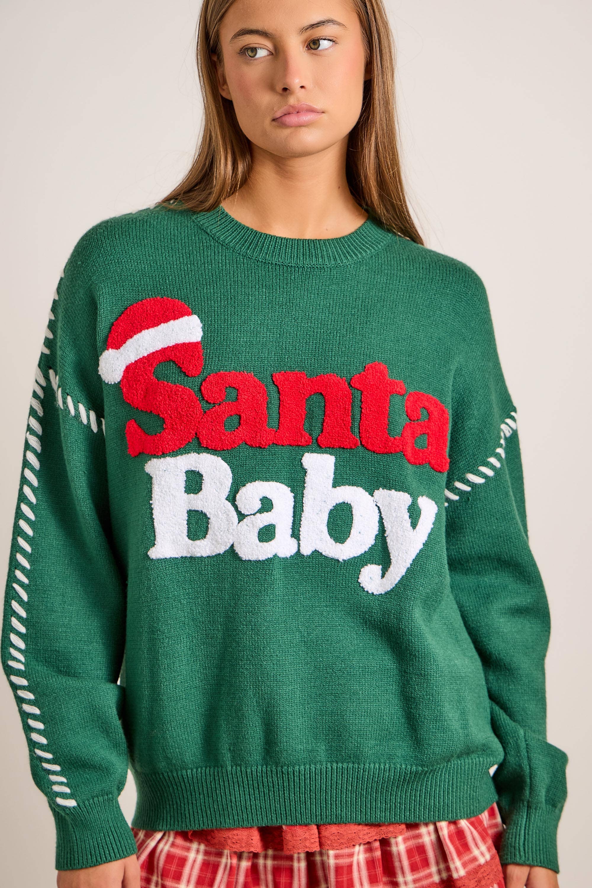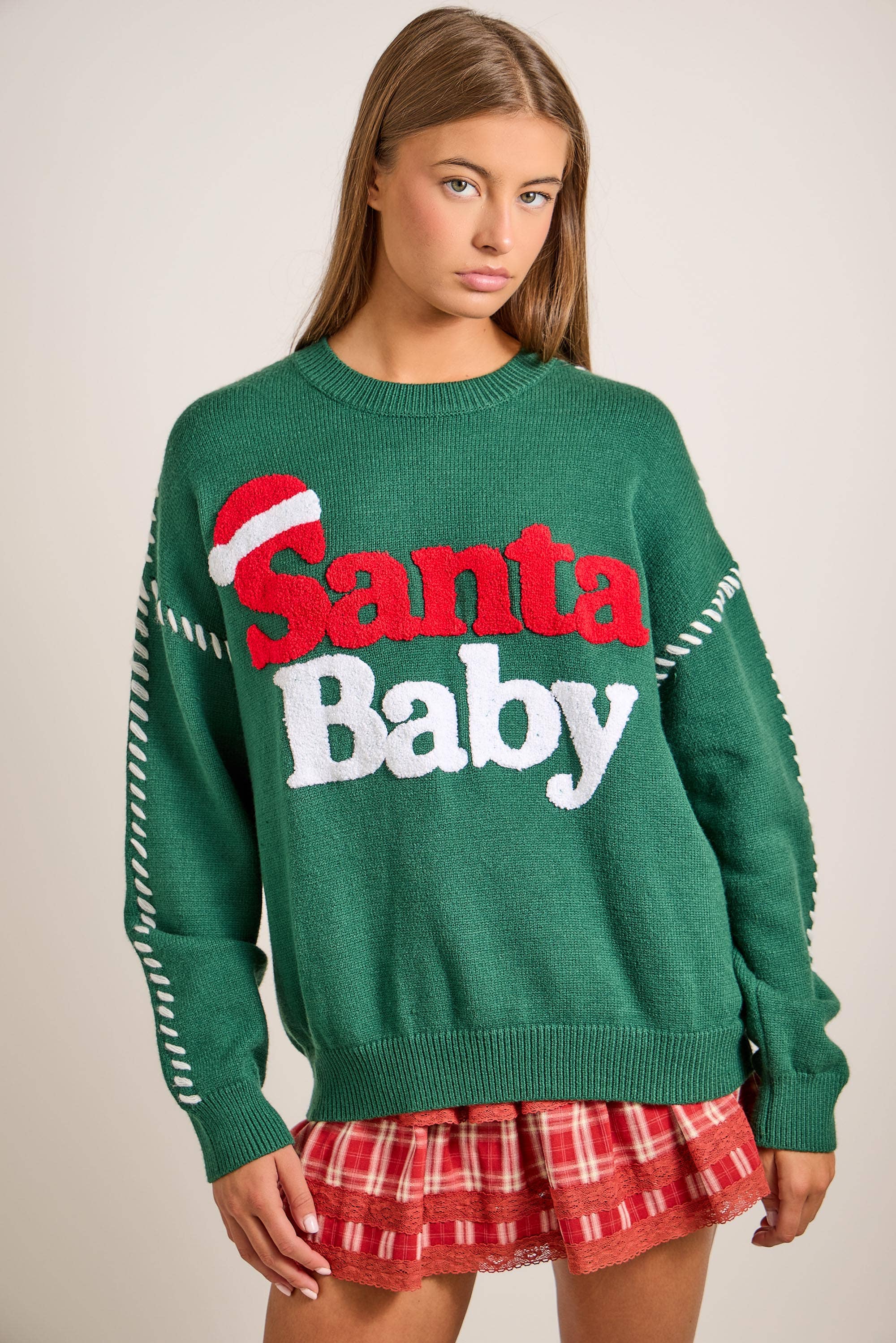 Get festive with our Santa Baby Knit Sweater. Designed in a classic holiday green, it features bold red and white lettering with a playful Santa hat detail. Cozy, relaxed, and eye-catching, this pullover is perfect for Christmas parties, family gatherings, and seasonal gifting. ✨ Features: Green knit sweater with “Santa Baby” lettering Santa hat embroidery adds festive charm Relaxed fit with crew neckline Soft, cozy knit fabric for winter comfort 🎄 Perfect for: Christmas celebrations & holiday parties Family photos & gatherings Seasonal gifting 🎀 Seasonal / Holiday Christmas Sweater Santa Baby Pullover Holiday Knit Top Festive Winter Sweater Holiday Party Outfit 🎀 Style / Detail Green Christmas Sweater Embroidered Holiday Knit Santa Hat Lettering Sweater Oversized Cozy Knit Cute Festive Pullover 🎀 Occasion / Fit Holiday Parties & Gatherings Family Christmas Outfit Giftable Holiday Knit Cozy Winter Outfit Seasonal Statement Top 📏 Sizes: S, M, L 🧵 Material: Acrylic/Polyester blend 🎀